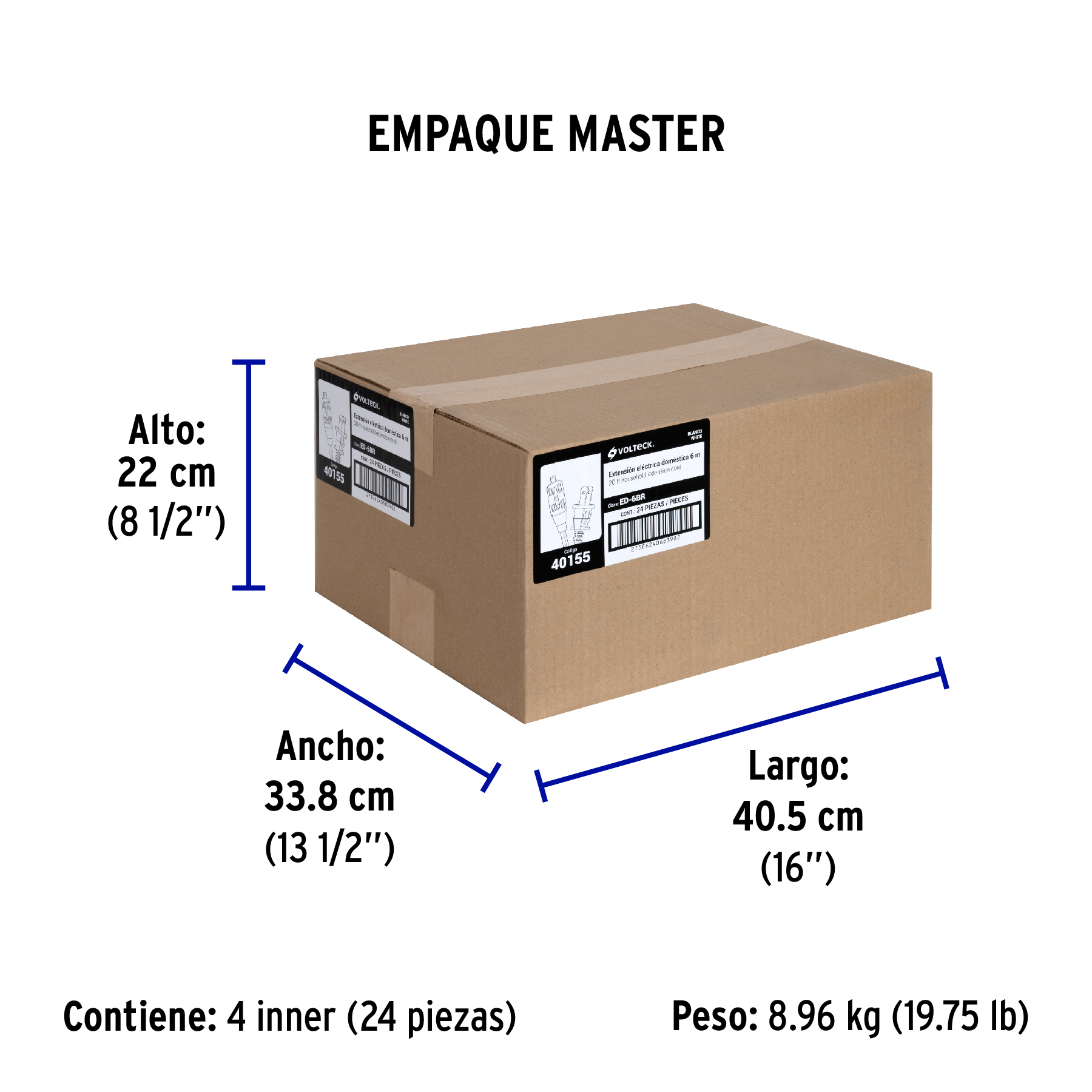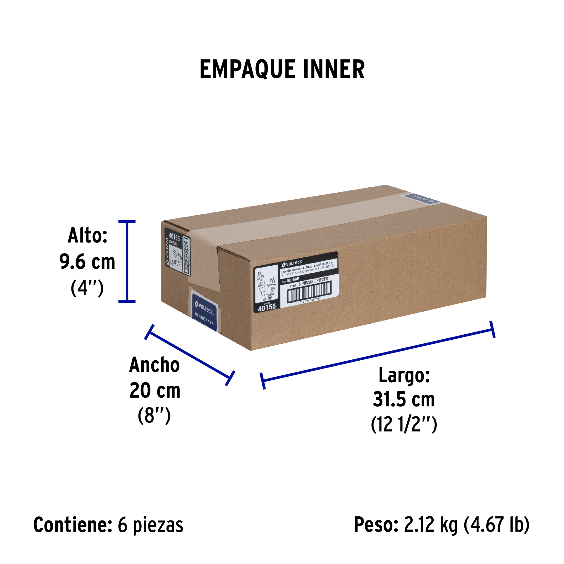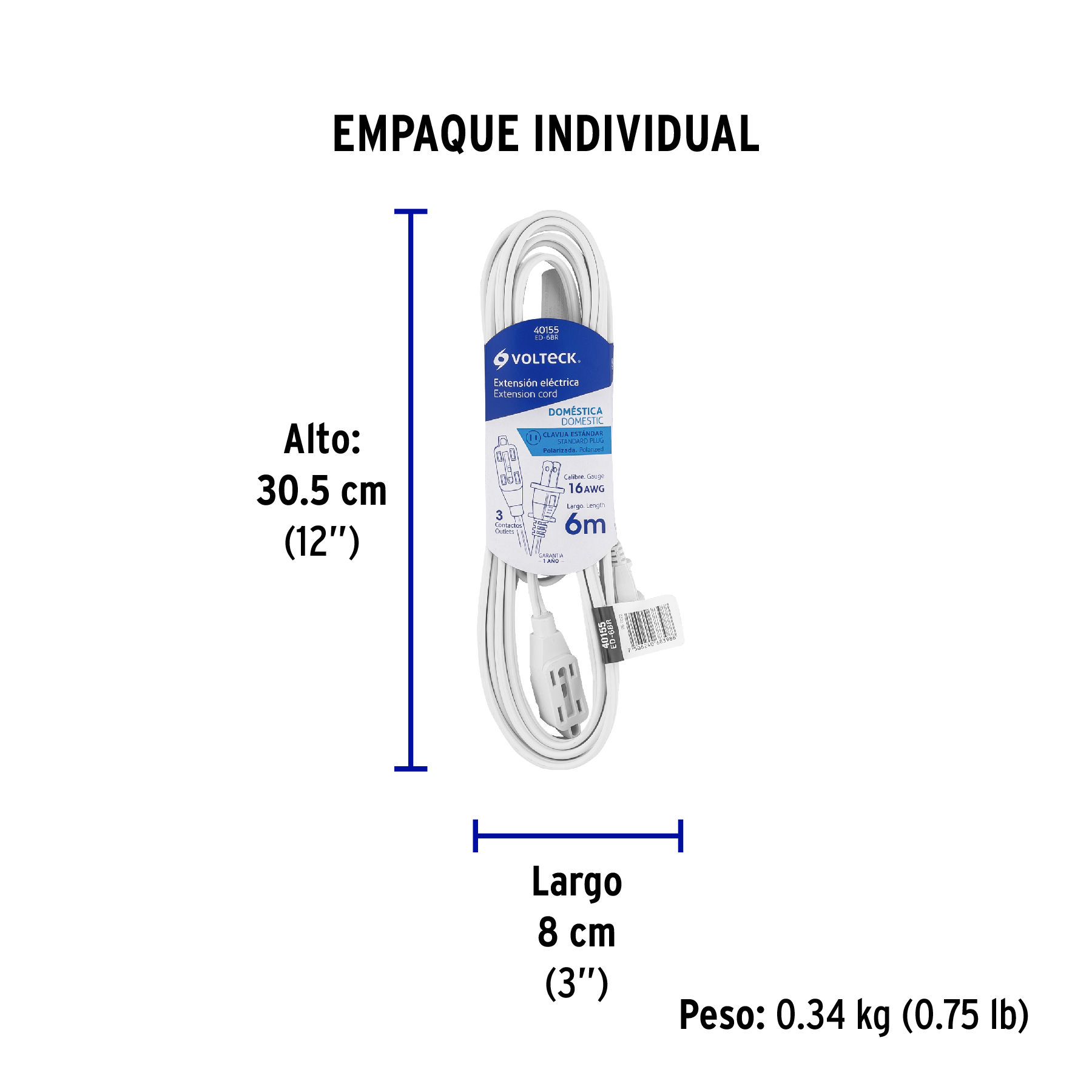 Extensión eléctrica doméstica 6 m clavija recta, blanca