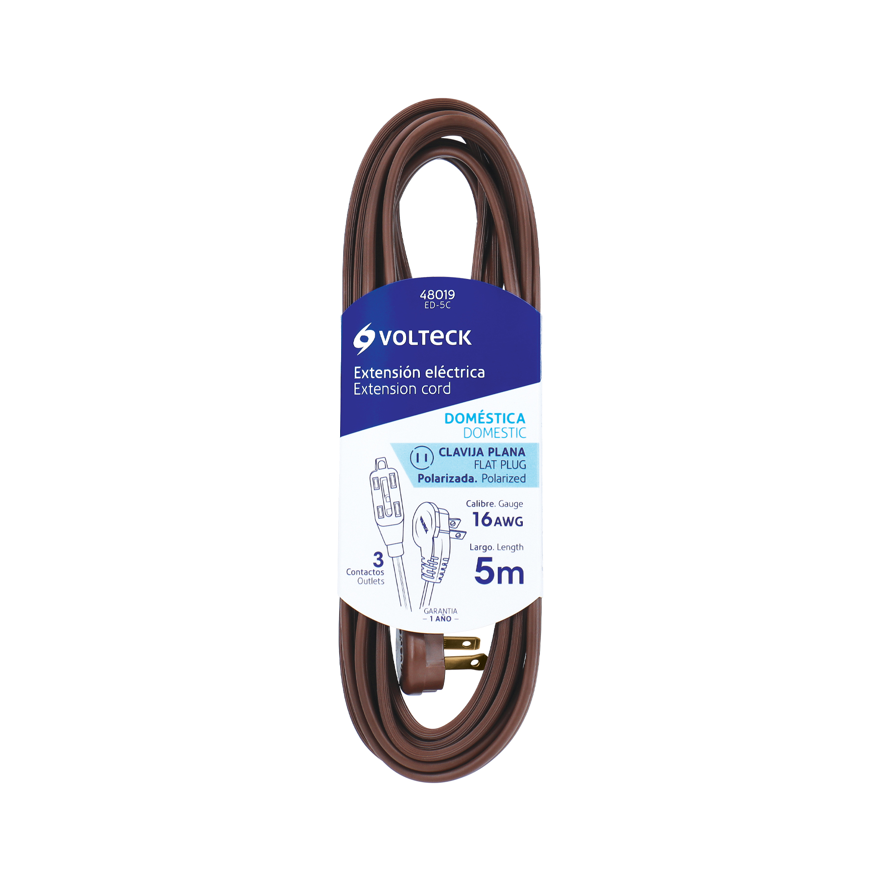 Extensión eléctrica doméstica 5 m clavija plana, café