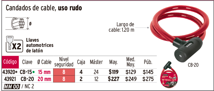 Candado de cable con llave, 20 mm X 1.20 m, HERMEX