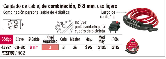 Candado de cable con combinación, 8 mm X 1.0 m, HERMEX
