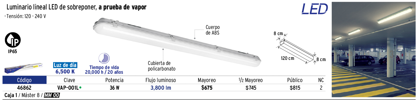 Luminario lineal LED 36W, 6500K, a prueba de vapor