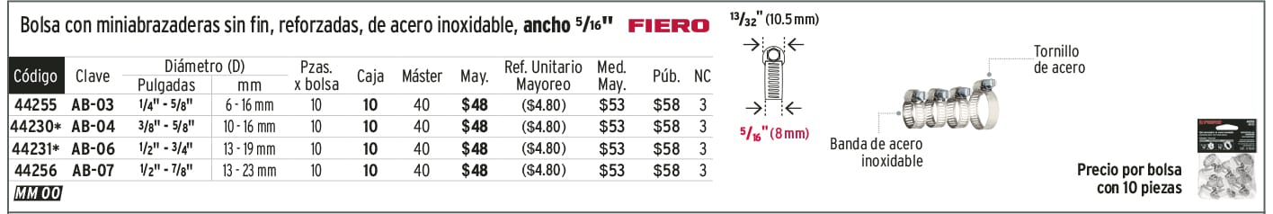 Bolsa con 10 abrazaderas mini sin fin #7, 1/2 - 7/8", FIERO