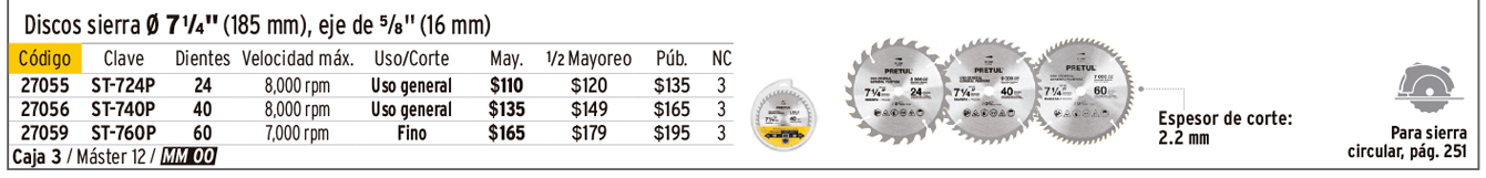 Disco sierra 7-1/4" p/madera, 60 dientes centro 5/8", PRETUL
