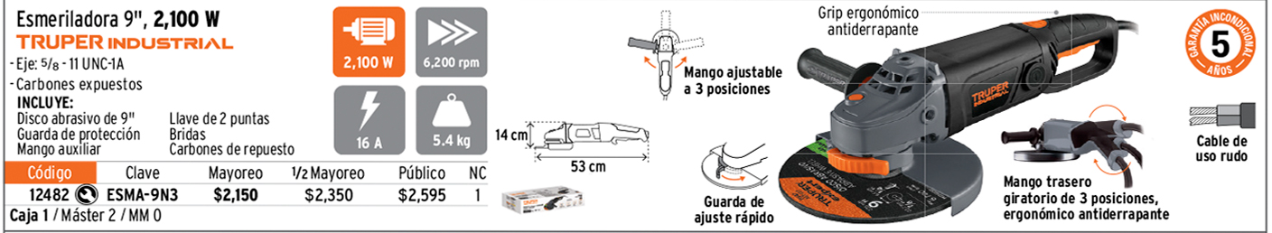 Esmeriladora angular 9", 2100W, TRUPER INDUSTRIAL
