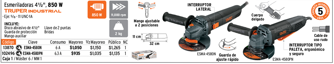 Esmeriladora angular 4-1/2", 850W, TRUPER INDUSTRIAL