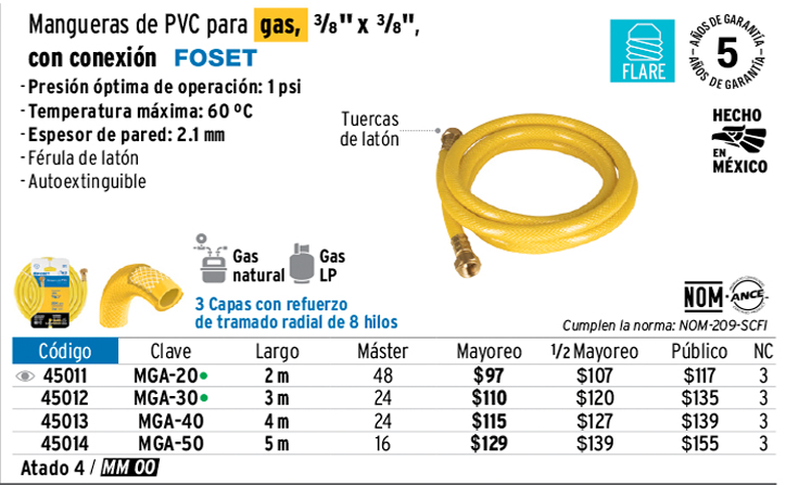 Manguera para gas, PVC amarilla, 3/8"flare, 4 m, FOSET