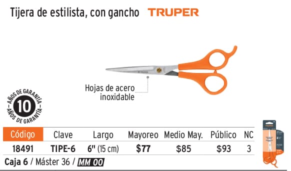 Tijera 6" estilista, con gancho, acero inoxidable, TRUPER