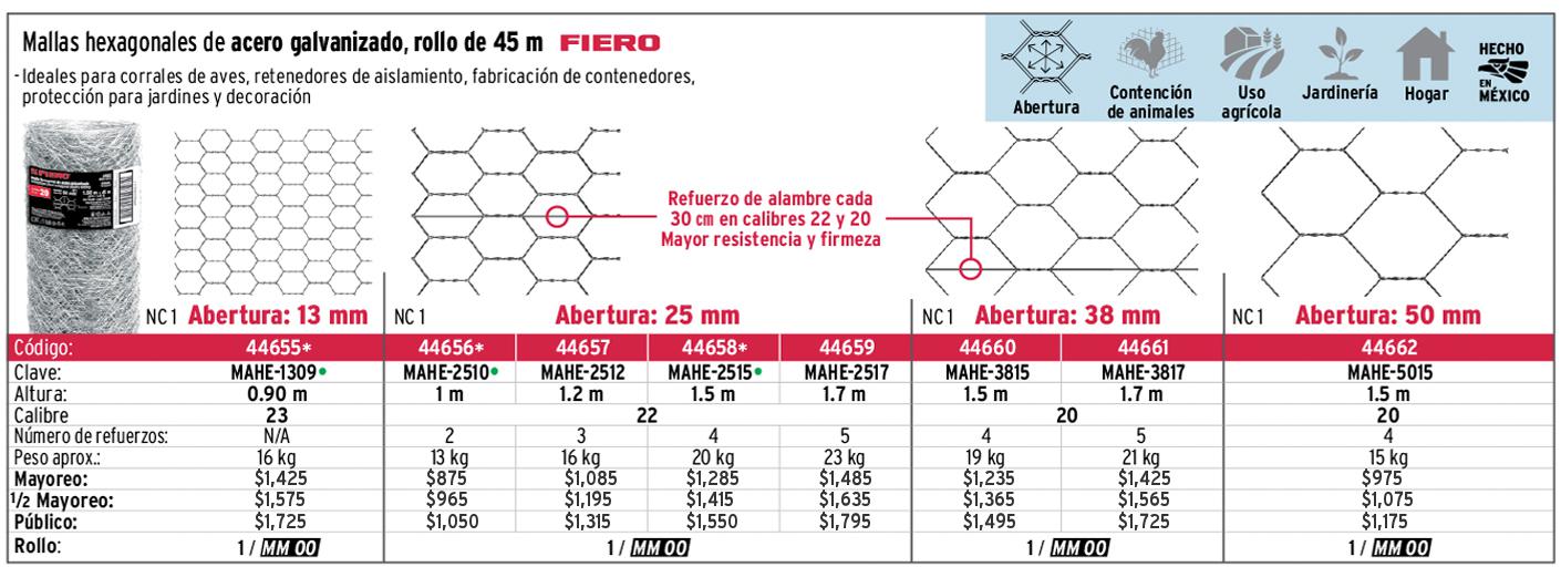 Rollo malla hexagonal cal.20, 1.75x 45m, abertura 38mm, 21kg