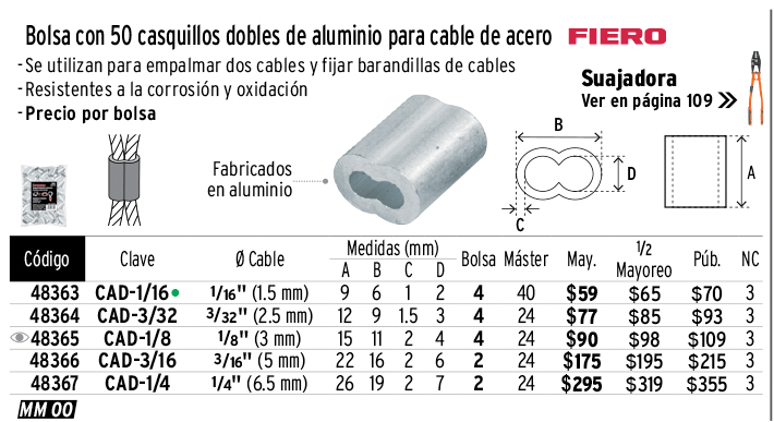 Bolsa con 50 casquillos dobles de aluminio, 3/16", FIERO