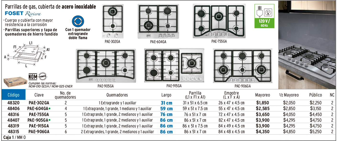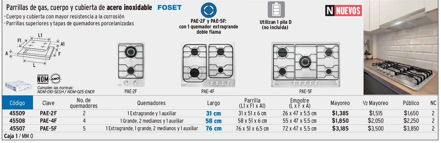 Parrilla gas empotrable 60 cm, 4 quemadores, esmalte, FOSET