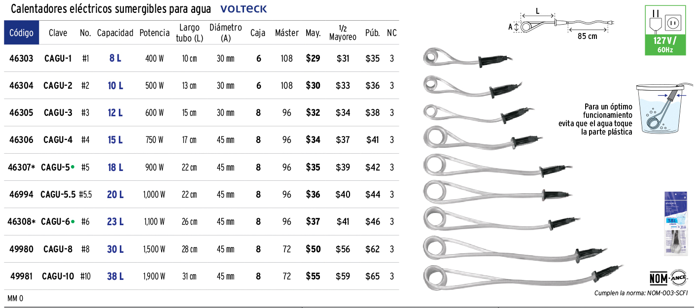 Calentador de inmersión para agua #10 (38 L), 1900W, VOLTECK