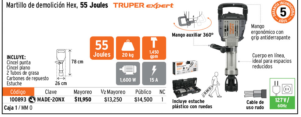 Martillo demoledor HEX 20 kg, 55J, 1600W, TRUPER EXPERT