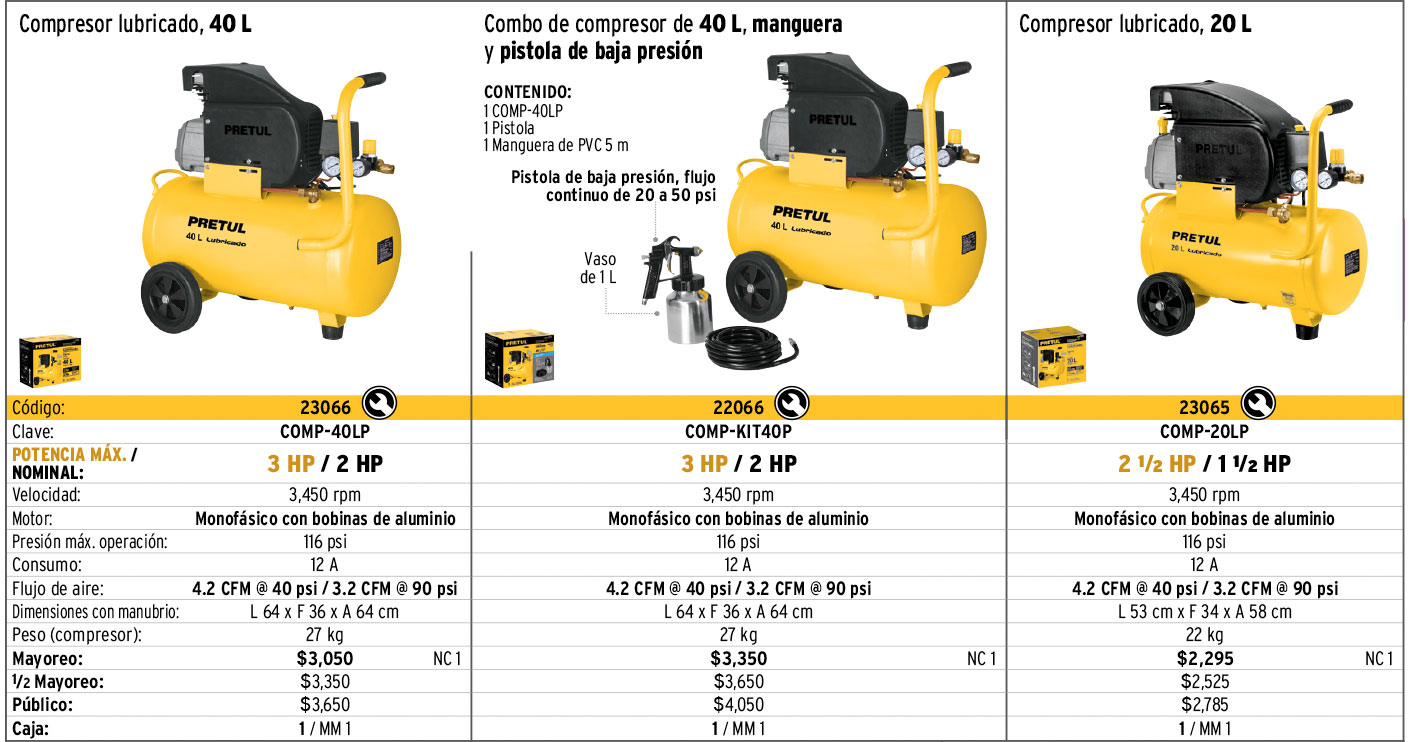 Compresor lubricado, 20L, 2-1/2HP, horizontal, 127V, PRETUL