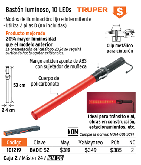 Bastón luminoso de 53 cm con luz LED y clip para cinturón