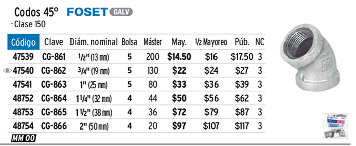 Codo 45° acero galvanizado de 1-1/2", FOSET