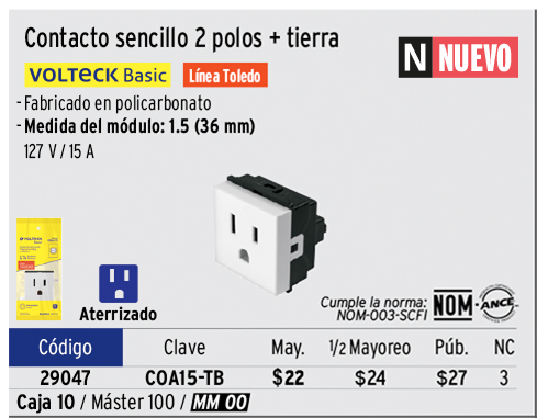 Contacto aterrizado de 1.5 módulos, línea Toledo, BASIC