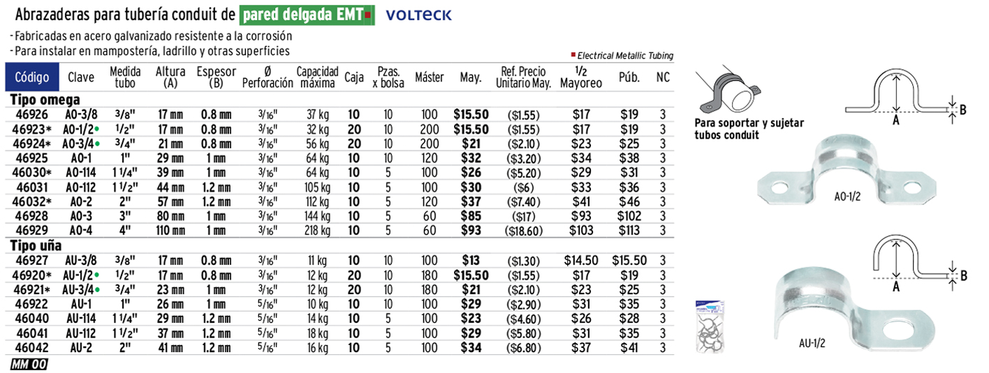 Bolsa c/10 abrazaderas tipo omega 1/2" p/tubo pared delgada