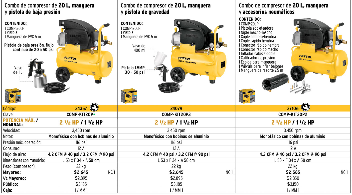 Kit Compresor lub, 20L, manguera y pistola baja,127V, PRETUL