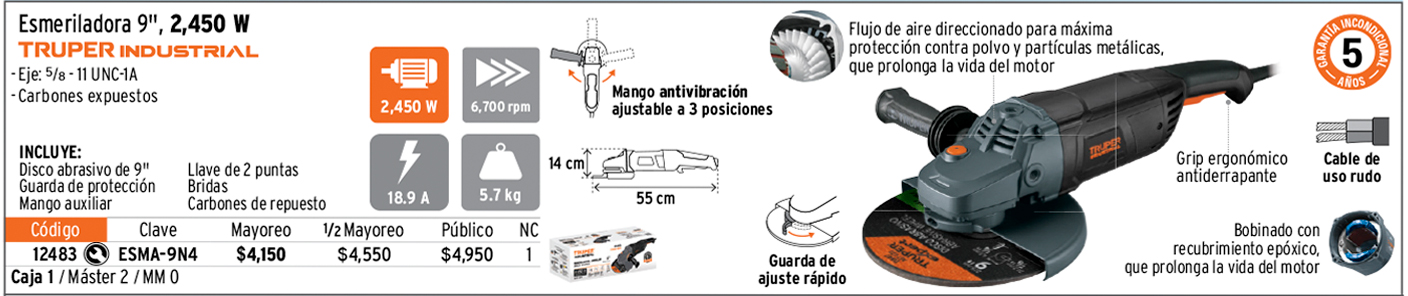 Esmeriladora angular 9", 2450W, TRUPER INDUSTRIAL