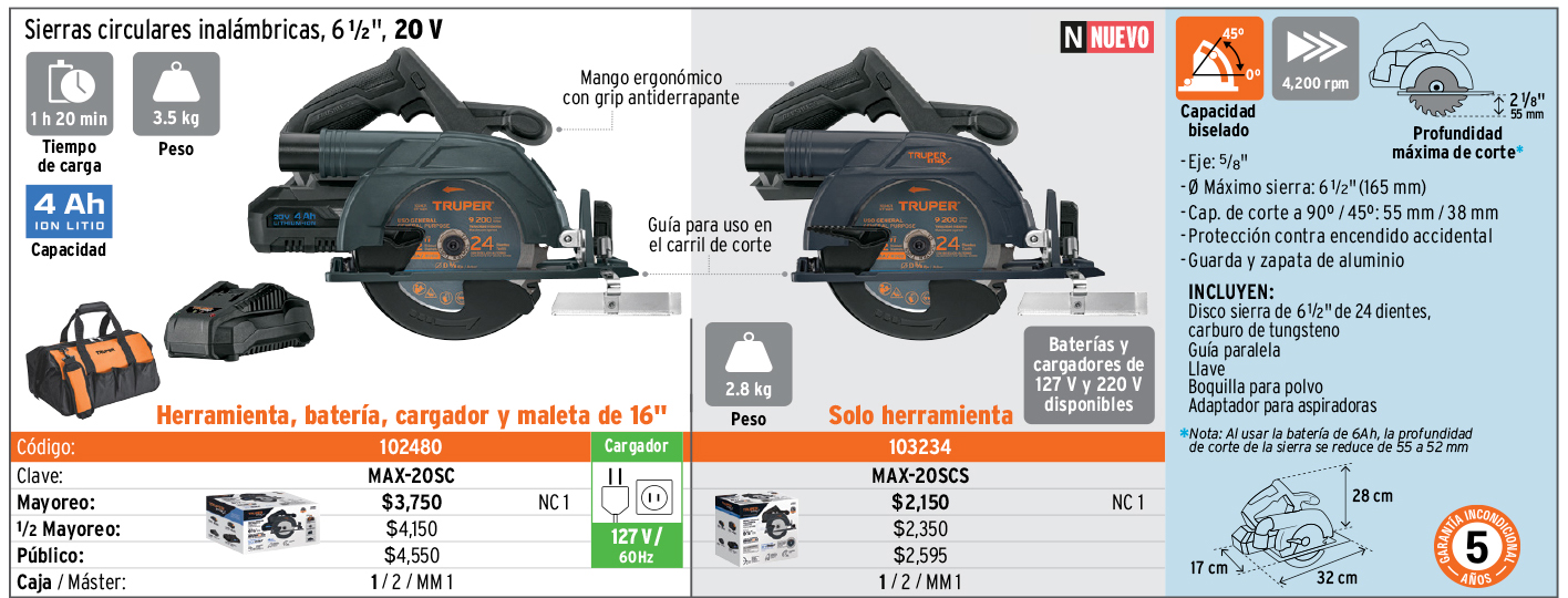 Sierra circular 6-1/2", 20V, 1 batería 4Ah, TRUPER PRO