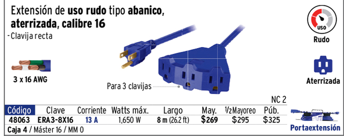 Extensión triple uso rudo 8 m tipo abanico 3x16 AWG, VOLTECK