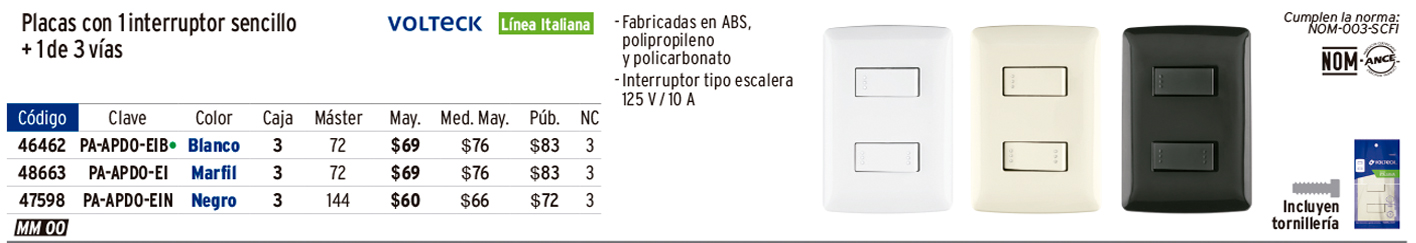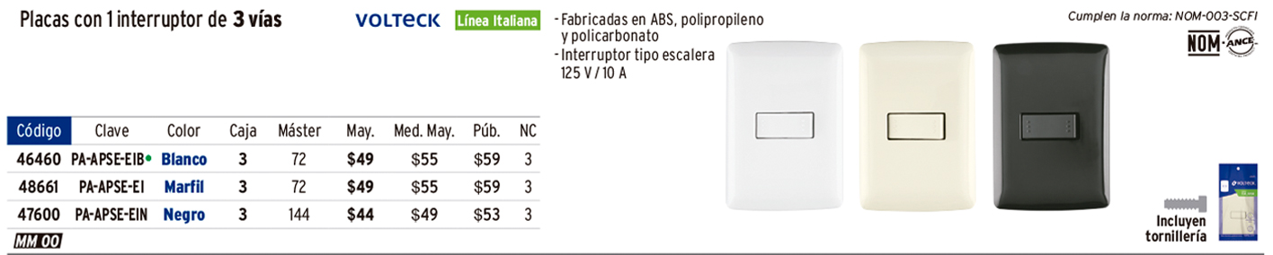 Interruptor de 3 vías, línea Italiana, color blanco, VOLTECK