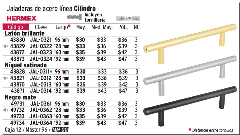 Jaladera de acero, 192mm, línea Cilindro, latón brillante