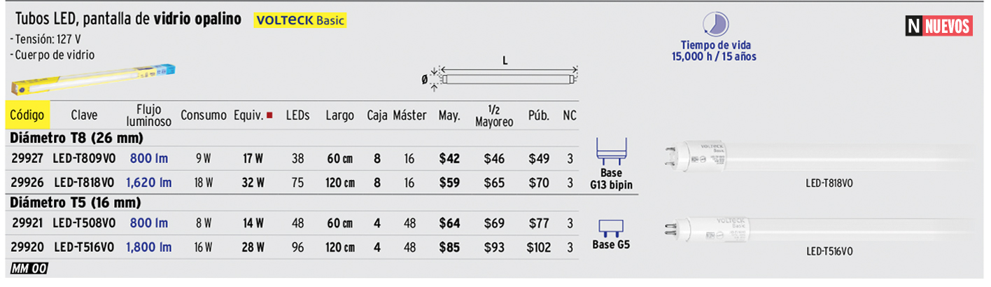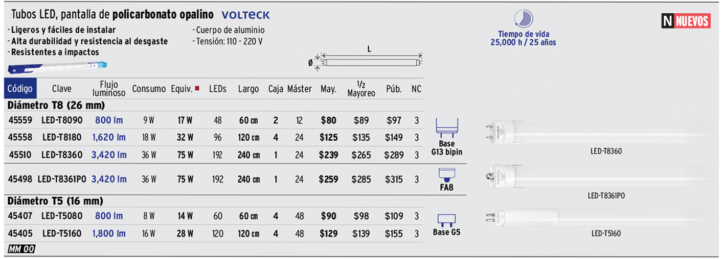 Tubo LED T8 36W G13, 6500K blanca fría, opalino, VOLTECK