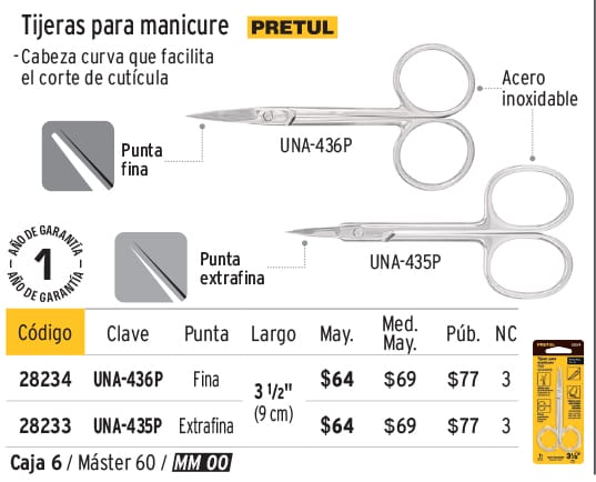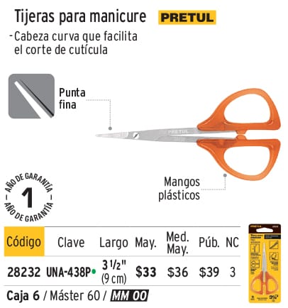 Tijera manicure 3-1/2", punta fina, PRETUL