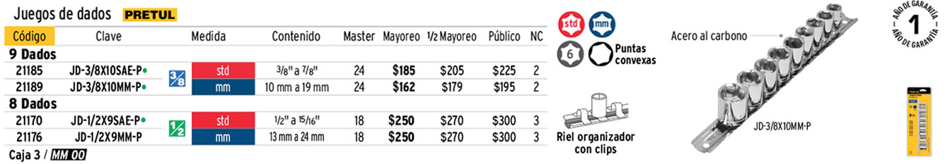 Juego de 9 dados cuadro 3/8" std, PRETUL