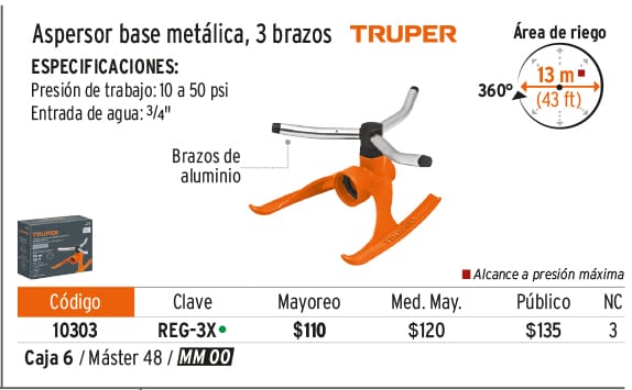 Aspersor b/metálica giratorio 3 brazos de aluminio, TRUPER