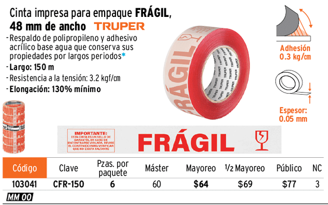 Cinta de empaque 48 mm x 150 m "Frágil", TRUPER