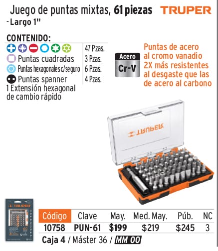 Juego de 61 puntas mixtas largo 1" en estuche plástico
