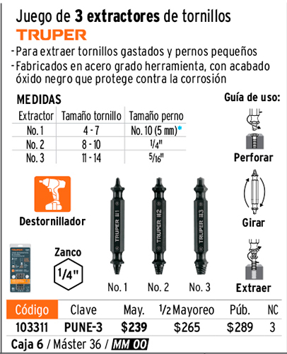 Blíster con 3 puntas extractoras de tornillos, TRUPER