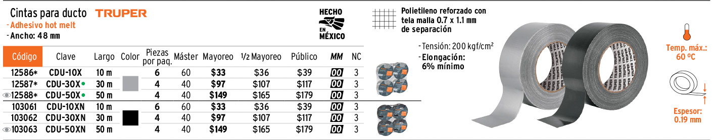 Cinta negra para ducto 30m x 48mm, espesor 0.19mm, TRUPER