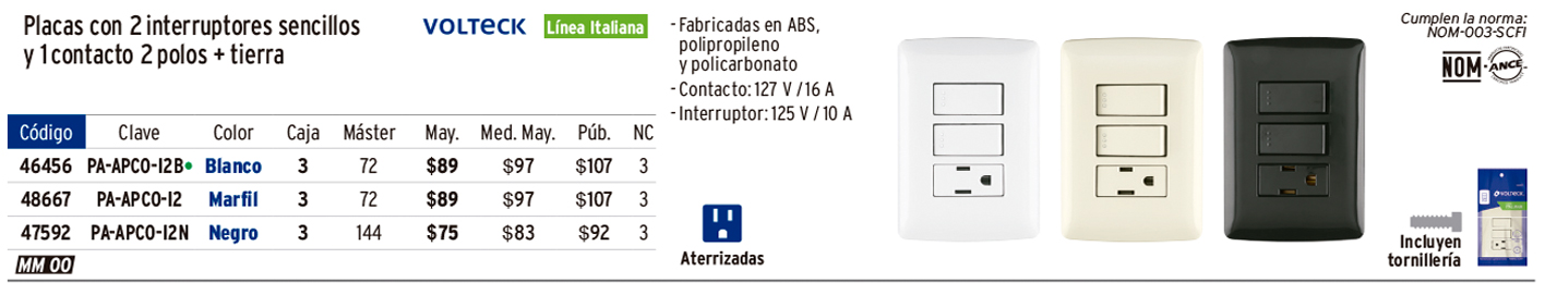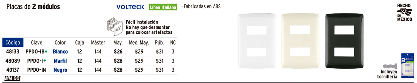 Placa de 2 módulos, blanca, Línea Italiana, VOLTECK