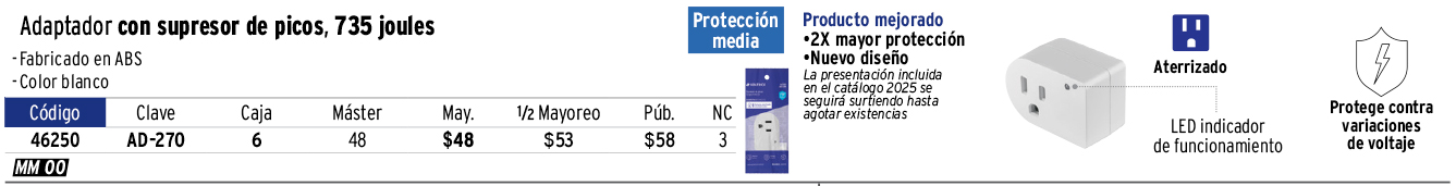 Adaptador con supresor de picos 270 joules, VOLTECK