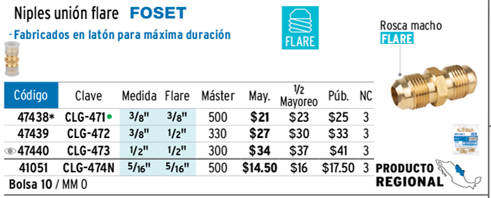 Niple unión de latón de 3/8" X 3/8", FOSET