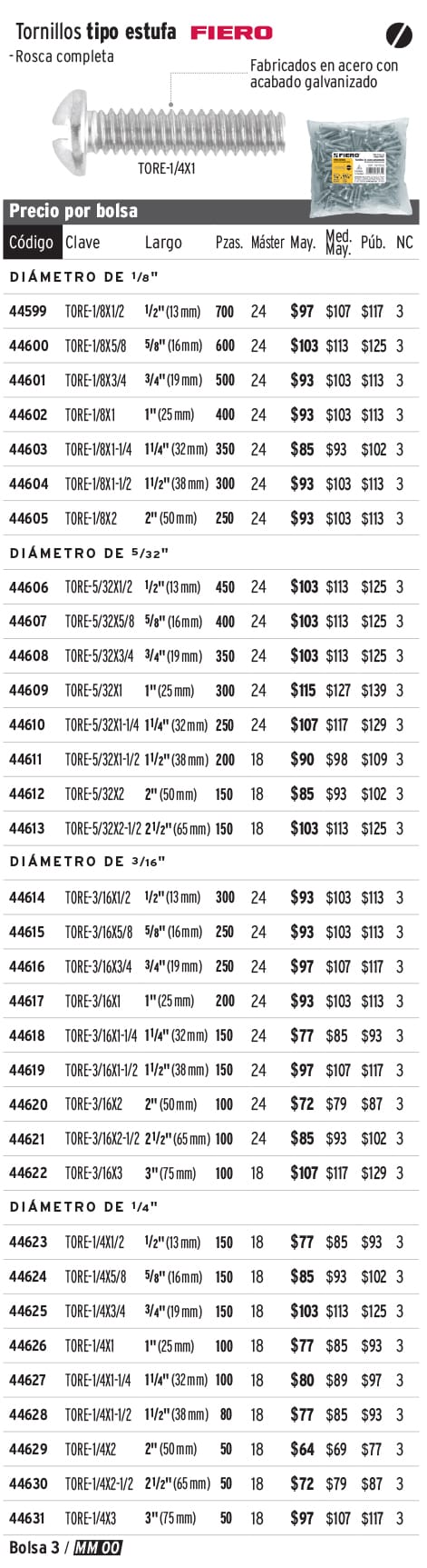 Bolsa con 400 tornillos 5/32" x 5/8" tipo estufa, FIERO