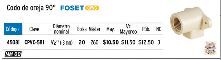 Codo oreja 90° de CPVC de 1/2", FOSET