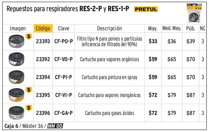 Cartucho de repuesto, vapores inorgánicos, PRETUL