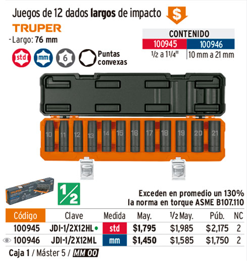 Juego de 12 dados largos de impacto cuadro 1/2", 6 puntas mm