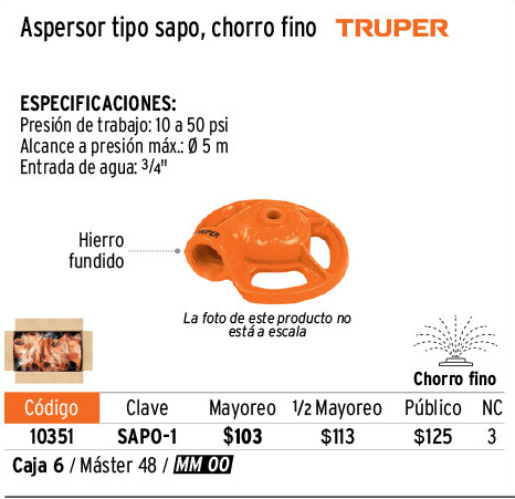 Aspersor base metálica, tipo sapo de chorro fino, TRUPER