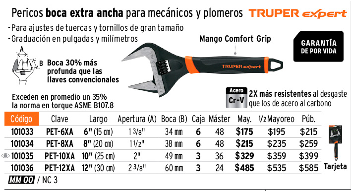 Llave ajustable (perico) 10" boca ancha Comfort Grip, EXPERT