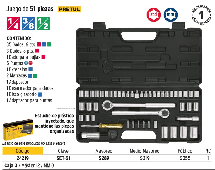 Juego 51 herramientas 1/4", 3/8" y 1/2" p/mecánico, PRETUL