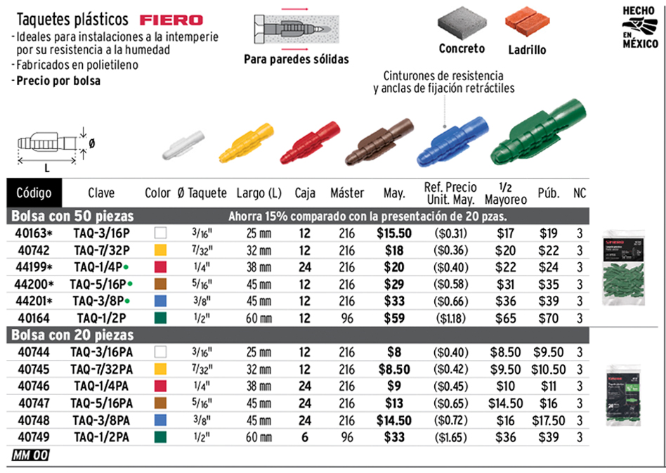 Bolsa con 50 taquetes de plástico 7/32", FIERO