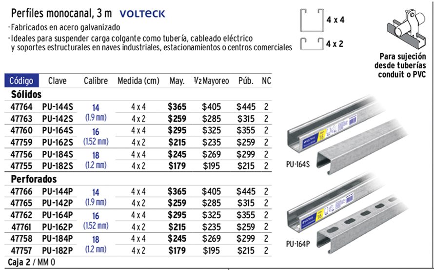 Perfil monocanal sólido de 3 m, 4 x 4 cm cal. 16, VOLTECK