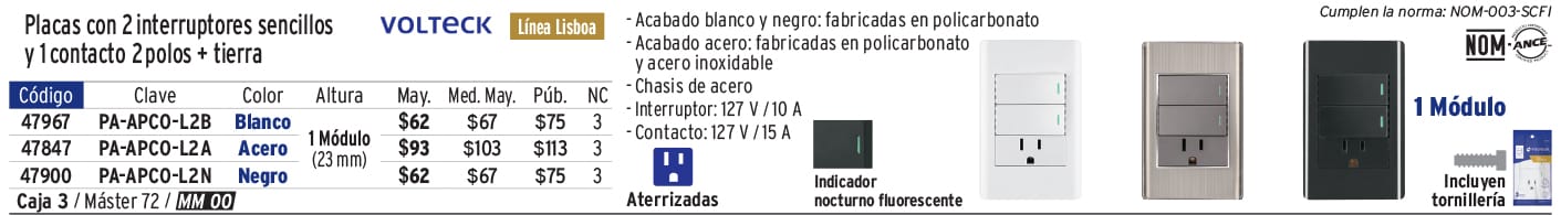 Placa armada negra 2 interruptores y contacto 1 mód, Lisboa