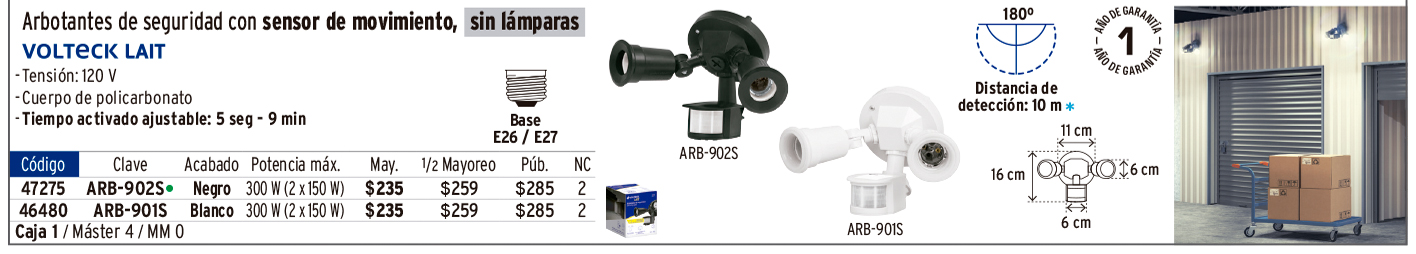 Arbotante negro c/sensor movimiento, lámparas no incluidas