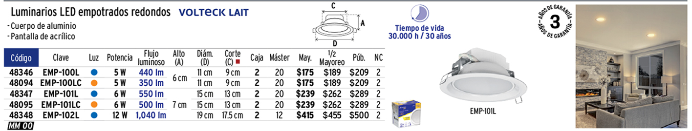 Luminario LED empotrable 6 W 3000 K, redondo, VOLTECK